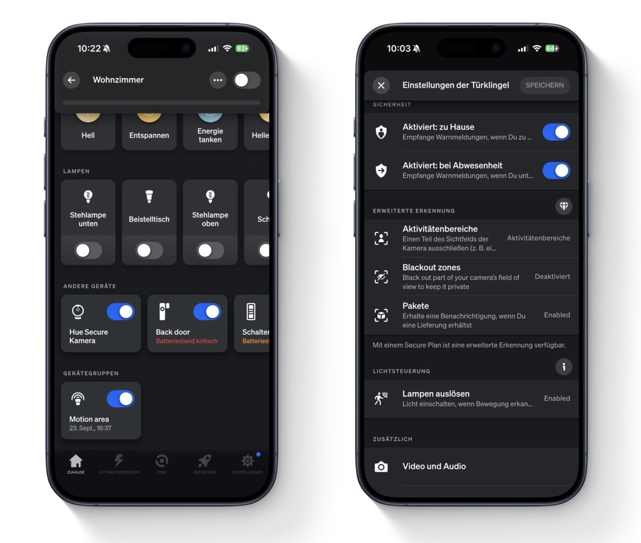After the update, I discovered even more new features, even though they weren’t yet visible in all rooms. As previously announced, accessories such as switches and sensors are now displayed in the room overview. You can find them directly below the scenes and lights for each room. You can then switch sensors and motion zones on and off directly in the room overview.
