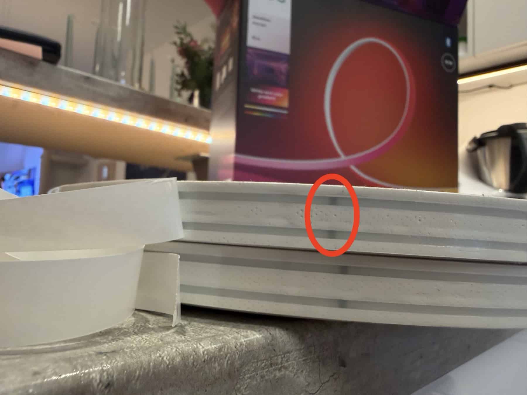 Why does Philips Hue make it so complicated? The Hue Ambiance Gradient Lightstrip, which also has an opaque silicone cover, had small arrows printed on the edge of the light strip. However, if the light strip is not installed in a concealed manner, these dark dots on the light-colored material can look quite unsightly.