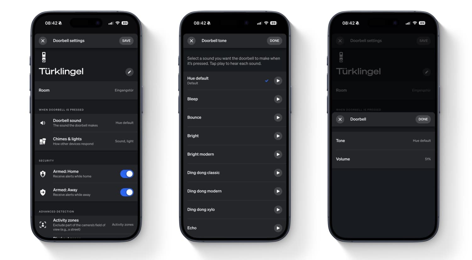 I have actually been asked about this topic several times in recent months. After Philips Hue had already been automatically activating the LED ring around the doorbell button for some time when someone approached, there are now additional options for the actual button press. Previously, a standard sound was always played at a fixed volume.