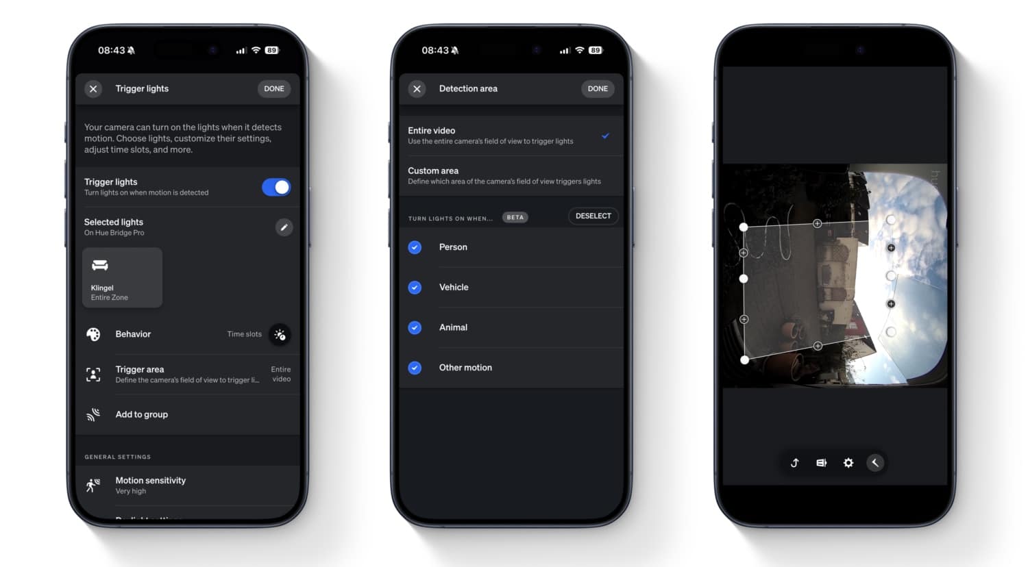 As you know, the Philips Hue Secure video doorbell can already switch on lights when movement is detected. You can now define this behaviour in more detail. In the ‘Trigger lights’ section, there is a new menu item called Trigger area. There you can define an area in the camera image to which motion detection should be limited. You can also limit motion detection to people, vehicles, animals or other movements.